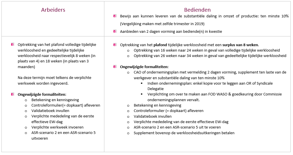 In het geval je als werkgever vanaf 01/09/2020 niet meer aan de voorwaarden voldoet om een beroep te doen op tijdelijke werkloosheid wegens overmacht ten gevolge van corona, is er voorzien in een tijdelijk aangepaste regeling inzake economische werkloosheid die geldig is tot en met 31/12/2020. Er zijn hierbij verschillen tussen arbeiders en bedienden, die je in onderstaande tabel kan terugvinden.